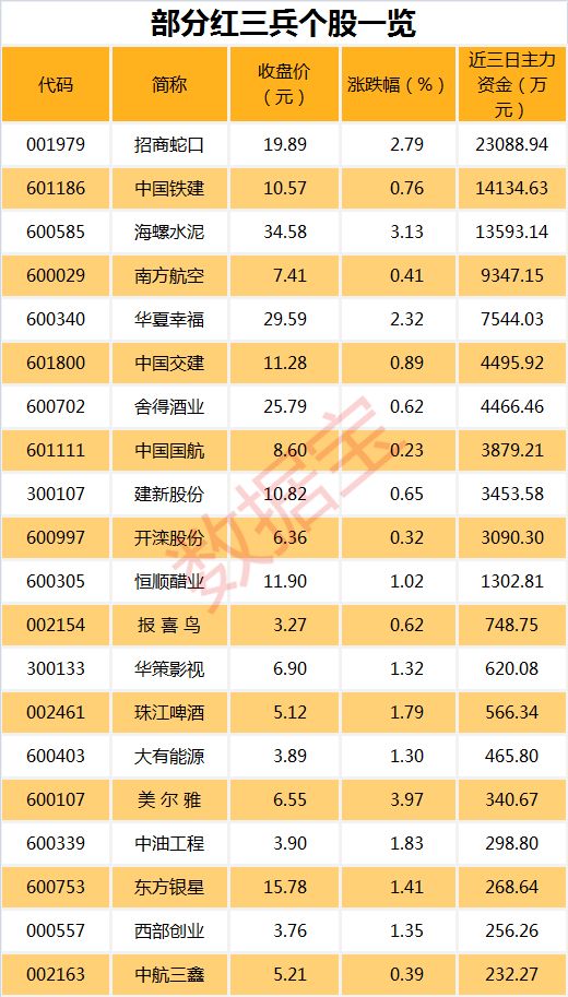 截至2月13日收盘,有54只A股K线呈现“红三兵”形态,期间部分个股获得主力资金追捧。这些个股中,有30只近三日主力资金净流入,最受资金青睐的招商蛇口、中国铁建、海螺水泥,近三日主力资金分别流入2.31亿元、1.41亿元、1.36亿元。