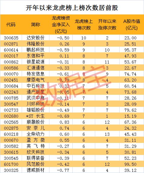 从上榜的股票来看,剔除近一年上市的次新股,龙虎榜上榜最频繁的是达安股份,开年以来累计上榜10次,该股上榜原因大多情况下是因为日换手率达到20%。伟隆股份、鹏起科技均上榜9次。与达安股份类似,伟隆股份上榜大多情况下是因为日换手率达到20%。