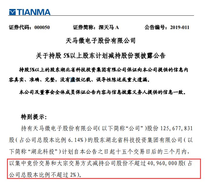 如昨日晚间,近期股价已翻倍的上市公司深天马A(000050.SZ)公告称,持有公司股份 125,677,831 股(占公司总股本比例 6.14%)的股东湖北科投,计划自公告之日起15个交易日后的3个月内, 以集中竞价交易和大宗交易方式减持股份不超过 40,960,000 股,占公司总股本比例不超过 2%。