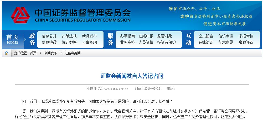针对市场近日场外配资有所抬头,可能加大投资者交易风险的情况,证监会昨日晚间回应:近期有关场外配资的报道增多,对此,证监会密切关注,指导有关方面依法加强对交易的全过程监管。各证券公司要严格执行经纪业务及融资融券客户适当性管理,加强异常交易监控,认真做好技术系统安全防护。同时,也希望广大投资者理性投资,防范投资风险。