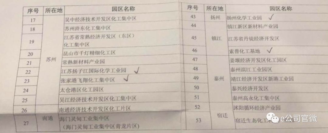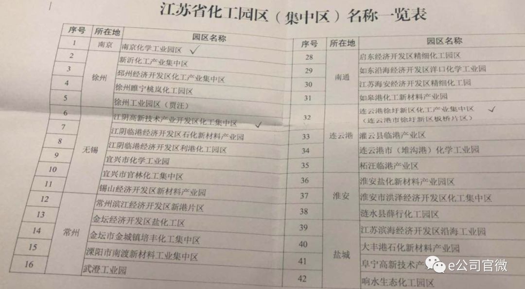 证券时报·e公司记者查询获悉,江苏省内目前共有53家化工园区(集中区):南京只有一家“南京化学工业园区”,为国家级化学工业园区。此外徐州有4家、无锡有6家、常州有5家、南通4家、连云港4家、淮安3家、苏州9家,南通2家,扬州1家,镇江3家,泰州5家,宿迁2家。盐城则有包括响水生态化工园区在内的4家化工园区和集中区。