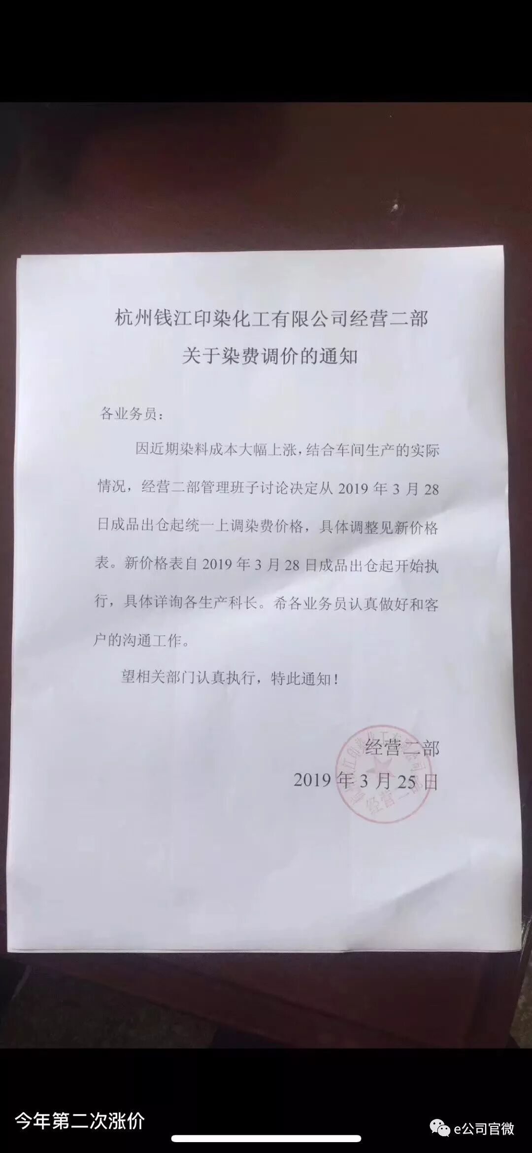 而在朋友圈里热传的是,3月28日这一天,绍兴8家印染企业发出涨价通知,从通知中可以了解,由于化工染料成本暴涨、染厂成本急速上升,自4月1日起,平板类产品涨价300元/吨,氨纶产品涨价400元/吨。