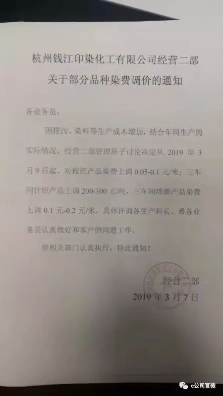证券时报·e公司记者获悉,杭州航民达美染整有限公司发布《关于上调针织面料染费价格的通知》,告知针织、针二车间、各业务员、各客户,自2019年4月8日起,成品出仓的针织面料系列在原有价格基础上统一上调200元/吨。