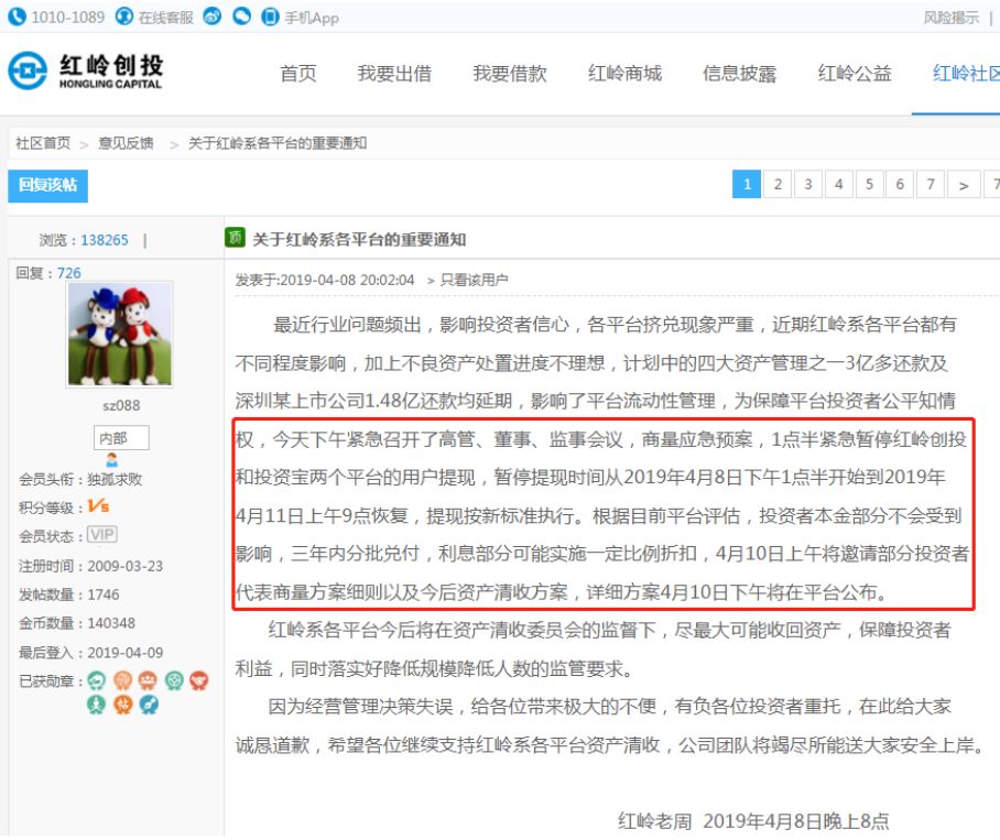 最近行业问题频出,影响投资者信心,各平台挤兑现象严重,近期红岭系各平台都有不同程度影响,加上不良资产处置进度不理想,计划中的四大资产管理之一3亿多还款及深圳某上市公司1.48亿还款均延期,影响了平台流动性管理,为保障平台投资者公平知情权,今天下午紧急召开了高管、董事、监事会议,商量应急预案,1点半紧急暂停红岭创投和投资宝两个平台的用户提现,暂停提现时间从2019年4月8日下午1点半开始到2019年4月11日上午9点恢复,提现按新标准执行。根据目前平台评估,投资者本金部分不会受到影响,三年内分批兑付,利息部分可能实施一定比例折扣,4月10日上午将邀请部分投资者代表商量方案细则以及今后资产清收方案,详细方案4月10日下午将在平台公布。