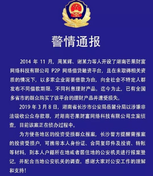 4月9日,湖南长沙市公安局岳麓分局警情通告显示:2019年3月8日,以涉嫌非法吸收公众存款罪,对湖南芒果财富网络有限公司立案侦查,目前该案正在侦办过程中。