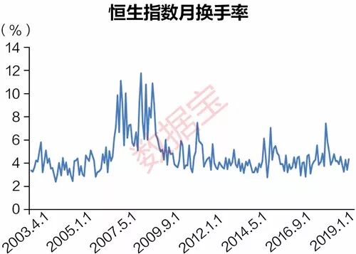 2002年以来,恒生指数的月均换手率为4.82%,七成月份的换手率在5%以下。2007年下半年,恒生指数换手率急速飙升,在指数突破30000点的10月指数换手率高达11.38%,创下了2002年以来的历史第二高。