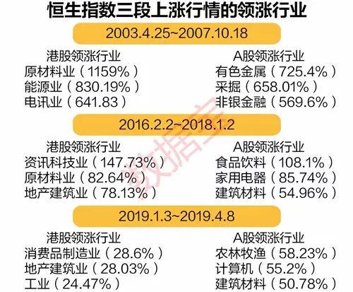 除了市场特征外,三轮上涨行情中领涨的行业和个股也不尽相同。2003至2007年的牛市中,原材料、能源和电信业的涨幅最大,恒生原材料业指数累计涨幅超过10倍,领涨行业与当轮A股行情的领涨行业重合度较高。