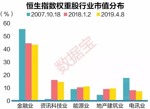 2007年恒生指数共有40只权重股,金融股11只,市值在权重股中占比56.7%。当前,恒生指数权重股数量扩充至50只,金融股市值虽然仍居各行业之首,但市值占比已降至43.8%。