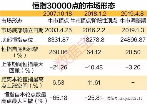 恒生指数历史上共有三次向上突破30000点大关,分别发生在2007年10月18日,2018年1月2日和2019年4月8日。2007年和2018年恒生指数向上突破30000点时,港股已分别走过了四年半和两年的长牛行情,指数自底部分别上涨了260%和64%,点位逼近当轮行情的顶点。而本轮行情下指数自底部拉升的时间仅有三个月。
