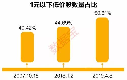 2007年恒生指数突破30000点时,股价在1元以下的港股数量有460家,占比40.42%,2018年1月2日这一比例上升至44.7%,而4月8日恒生指数再次向上突破30000点时,1元以下个股已占比过半。