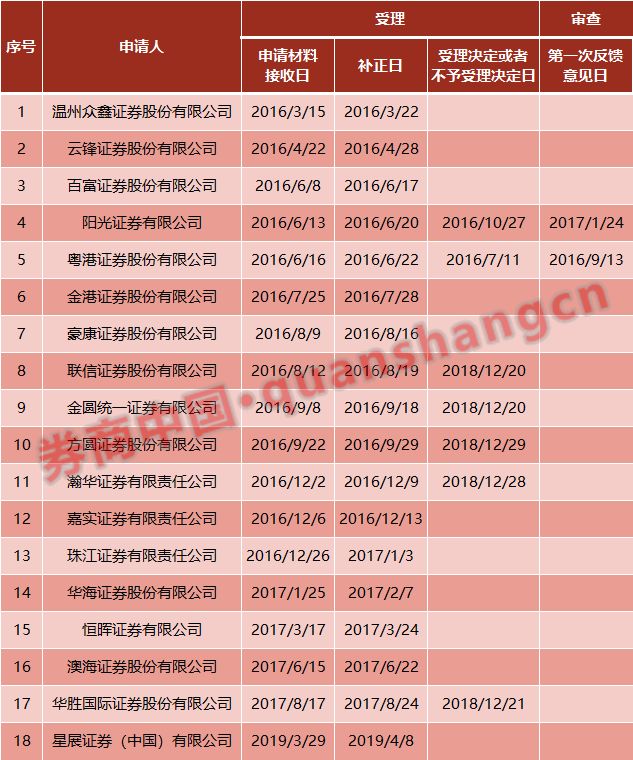 从申请时间上来看,上述待审券商中有13家在2016年申请材料被接收,4家在2017年9月前接收,并均进行了材料补正。其中,粤港证券、阳光证券两家进度较为靠前,分别在2016年9月13日、2017年1月24日获得第一次反馈意见,其余券商尚未进行至审查阶段。