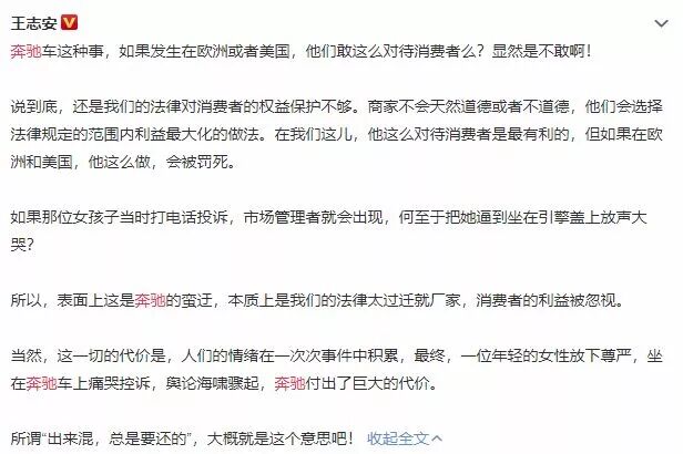 奔驰车这种事,如果发生在欧洲或者美国,他们敢这么对待消费者么?显然是不敢啊!说到底,还是我们的法律对消费者的权益保护不够。商家不会天然道德或者不道德,他们会选择法律规定的范围内利益最大化的做法。在我们这儿,他这么对待消费者是最有利的,但如果在欧洲和美国,他这么做,会被罚死。如果那位女孩子当时打电话投诉,市场管理者就会出现,何至于把她逼到坐在引擎盖上放声大哭?所以,表面上这是奔驰的蛮迂,本质上是我们的法律太过迁就厂家,消费者的利益被忽视。当然,这一切的代价是,人们的情绪在一次次事件中积累,最终,一位年轻的女性放下尊严,坐在奔驰车上痛哭控诉,舆论海啸骤起,奔驰付出了巨大的代价。所谓“出来混,总是要还的”,大概就是这个意思吧