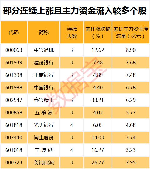 值得注意的是,385只连续上涨个股中,32只个股期间主力资金累计净流入超过亿元。其中,累计资金流入最多的为中兴通讯,主力资金累计流入8.90亿元。