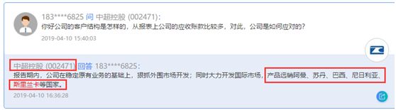 中超控股也在互动平台上对上述内容进一步确认。公司表示,在报告期内,公司在稳定原有业务的基础上,狠抓外围市场开发;同时大力开发国际市场,产品远销阿曼、苏丹、巴西、尼日利亚、斯里兰卡等国家。