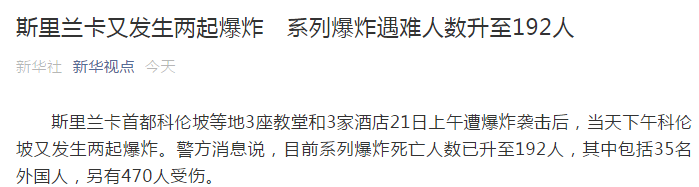 斯里兰卡官方现在尚没有公布确切的伤亡数字。不过,斯里兰卡第一电视台新闻网站报道,此前六起爆炸导致的死亡人数升至185人。