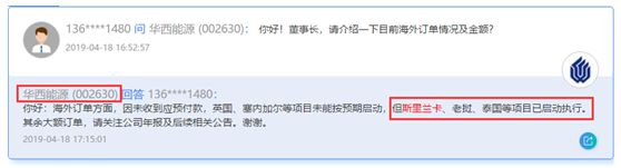 华西能源近日在互动平台上表示,在海外订单方面,因未收到应预付款,英国、塞内加尔等项目未能按预期启动,但斯里兰卡、老挝、泰国等项目已启动执行。