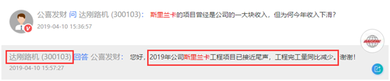 不过,斯里兰卡项目对达刚路机的影响今年或进一步减少。达刚路机近日在互动平台上表示,2019年公司斯里兰卡工程项目已接近尾声,工程完工量同比减少。