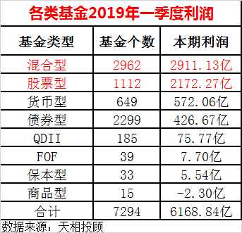 天相投顾数据显示,混合基金及股票基金成为一季度最大赢家,其中,混合型基金实现利润2911.13亿元,混合型基金无论是基金只数还是利润总额均排在八大类基金首位,此外,股票型基金今年一季度也实现了2172.27亿元利润,混合型加股票型基金合计利润总额占到全部公募基金利润总额八成以上。