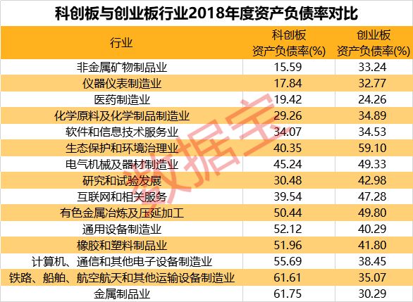 与创业板对比来看,科创板里9个行业的资产负债率低于创业板同行业水平。如创业板非金属矿物制品业的资产负债率33.24%,高出科创板同行业15个百分点以上;创业板仪器仪表制造业的资产负债率也高出科创板近15个百分点。值得一提的是,科创板资产负债率最大的金属制品业以及铁路、船舶、航空航天和其他运输设备制造业,远高于创业板同行业的资产负债率。