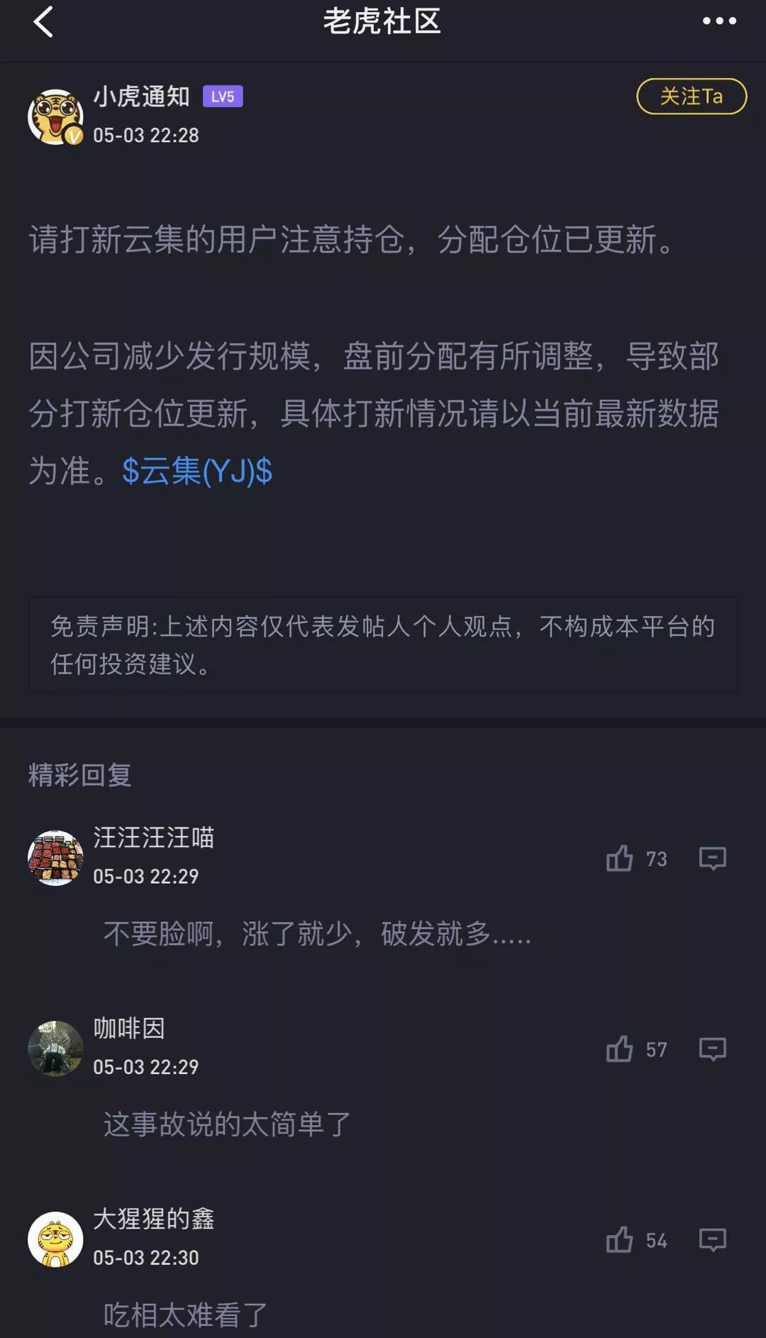 有消息称,此次事故是因为云集临时减少发行量,导致中签规则被打乱,进而导致了老虎证券对客户的中签数量展示错误。不过这样的解释,尚不能得到用户的理解。关于变动客户持仓数据、云集临时减少发行量、最初中签数、老虎证券内部运营处理效率低下的讨论,一直活跃在讨论区内。