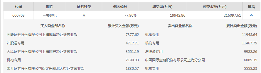 e公司讯,5月15日,三安光电(600703)逆市下跌5.99%,跌幅为两市之最,且盘中触及跌停。盘后数据显示,机构资金为出货主力,三个机构席位合计卖出2.9亿元,另有一个机构席位买入2199万元。沪股通专用席位买入4717万元同时卖出9988万元。国联证券上海邯郸路营业部买入7378万元,位居买一席位。
