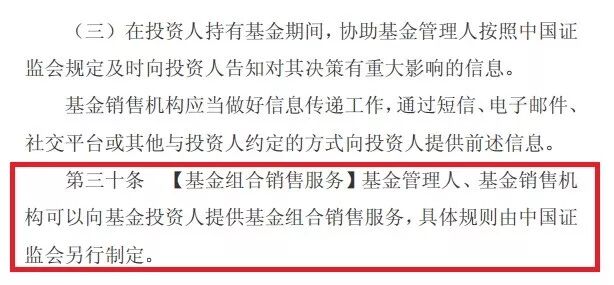 今年2月22日,证监会下发《公开募集证券投资基金销售机构监督管理办法(征求意见稿)》及相关配套规则,其中也提到,基金管理人、基金销售机构可以向基金投资人提供基金组合销售服务,具体规则由证监会另行制定。
