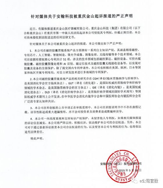 此前,针对媒体报道的重庆金山医疗器械有限公司、重庆金山科技(集团)有限公司(以下合称重庆金山)在重庆市第一中级人民法院起诉安翰科技侵犯其专利权。安翰科技曾发声明否认接收到法院送达的任何法律文书。