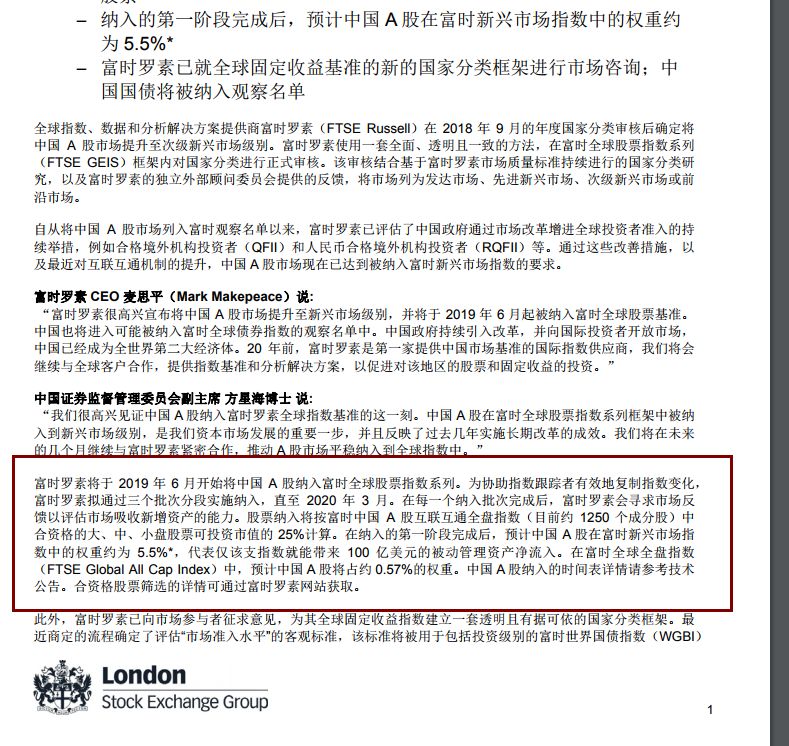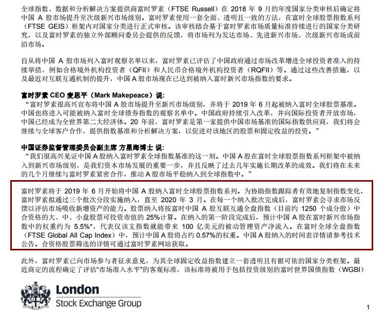 继MSCI之后,富时罗素在2018年9月宣布将中国A股纳入其指数体系。A股纳入富时指数将基于陆股通部分,共分三批次进行,分别在2019年6月、9月和2020年3月,进度为20%、40%、40%。