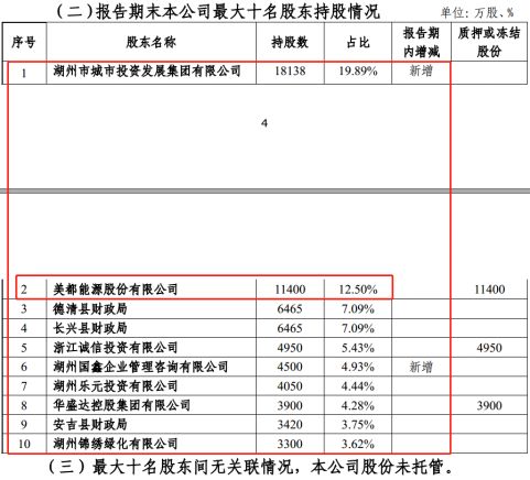 根据湖州银行在中国货币网的公示年报,美都能源为该行第二大股东,持有1.14亿股、占比12.5%;该行实控人为湖州市政府,第一大股东为湖州市城投(持股占比19.89%)。