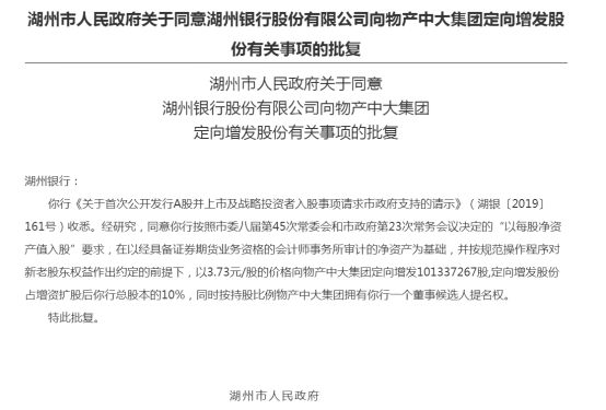 券商中国记者了解到,湖州银行向物产中大定向增发已获得湖州市政府(湖州银行实控人)的同意批复。这份署日期为5月8日的湖州市政府公文显示,以“每股净资产值入股”要求,按规范操作程序对新老股东权益作出约定的前提下,以3.73元/股的价格向物产中大定向增发1.013亿股(占增资扩股后总股本的10%),同时按持股比例物产中大获得一个董事候选人提名权。