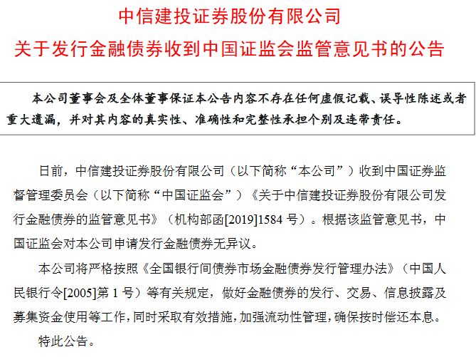 6月25日晚间,中信证券、国泰君安、华泰证券、中信建投证券、申万宏源证券、广发证券和招商证券七家券商陆续公告称,收到中国证监会监管意见书,对公司申请发行金融债券无异议。