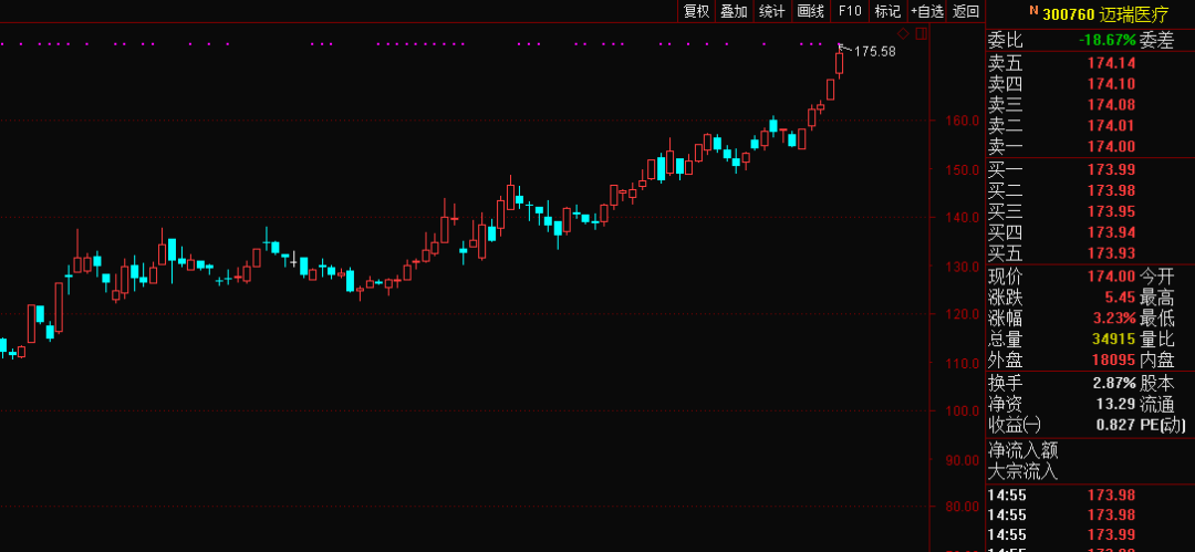 次新股迈瑞医疗股价再创新纪录,A股市值达到2115亿元,坐稳创业板市值一哥宝座。