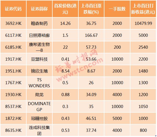 新股首日表现会各有不同。比如翰森制药,一手2000股,首发价格14.26港元,上市首日涨幅36.75%,那么上市首日打新收益可达1.05万港元。日照港裕廊上市首日更是高达167%的涨幅,首日打新收益可达5000港元。