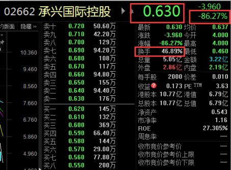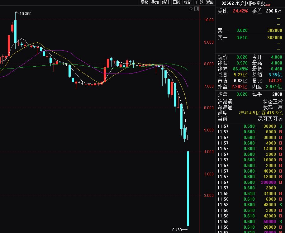 港股承兴国际控股更是直接“闪崩”,上午最低跌至0.46港元/股,较前一日(7月5日)收盘价4.59港元/股,直接下跌约90%,同时其成交额、换手率亦显著放大。截至记者发稿,承兴国际控股上午共成交3.35亿港元,换手率高达46.89%,而7月5日整日,其共成交4299万港元,换手率为15.67%。