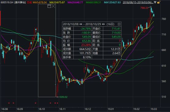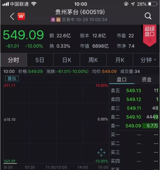 受三季度业绩不及预期影响,2018年10月28日贵州茅台开盘跌停,股价创一年新低,跌破600元大关,报549元/股,市值蒸发近800亿元。跌停板封单高达5.7万手,约人民币30亿元。