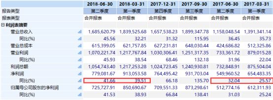 万得数据显示,2018年第一季度和2017年第一季度,贵州茅台归属于上市公司股东的净利润分别约为85亿、61亿,同比增幅各在39%、25%左右。