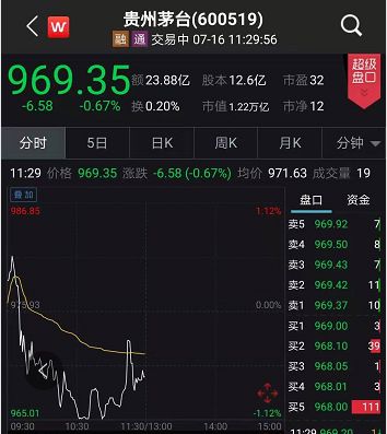 16日早盘,贵州茅台弱势整理,截止发稿,贵州茅台报收969.35元,微跌0.67%。