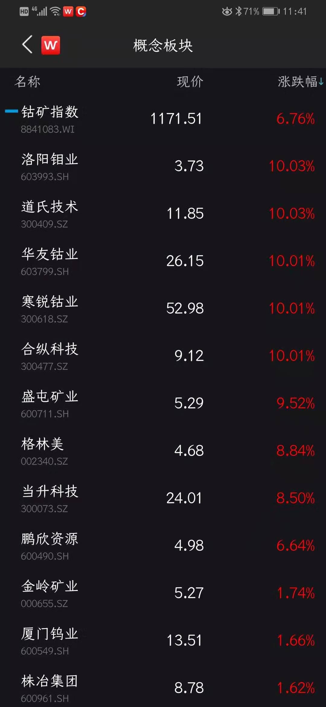 当日早盘,Wind钴矿指数也出现大幅上涨。截至上午收盘,该指数上涨6.76%,板块内13只个股近乎全部飘红。记者粗略计算,仅7日早盘钴概念股累计市值增长达164亿元。