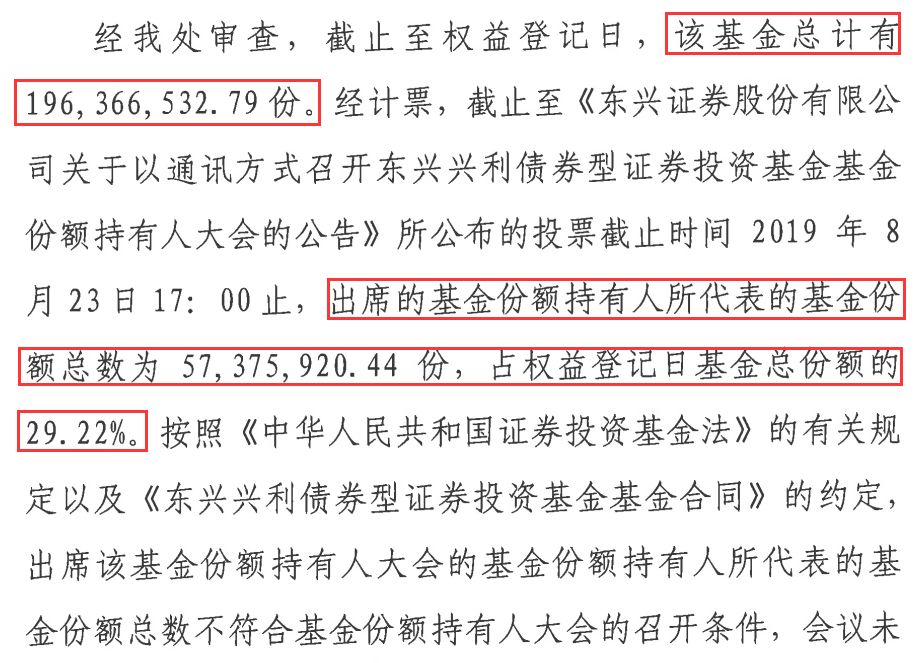 据悉,东兴兴利此次召开持有人大会份额持有人权益登记日为8月8日,截至当日,该基金共计1.96亿份。公告显示,截至所公布的投票截至时间8月23日下午5点,出席的基金份额持有人所代表的基金份额总数为5737.59万份,占权益登记日基金总份额的29.22%。