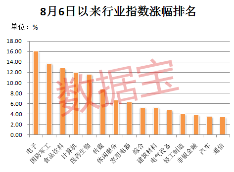 自8月6日沪指阶段低点至今,科技类板块的持续活跃为市场注入了新动力。数据显示,8月6日以来,电子、国防军工、食品饮料、计算机、医药生物等行业指数累计涨幅均超过10%,其中电子指数累计涨幅16.08%排名首位。