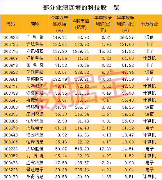 整体上看,近期科技股的大涨浪潮,似乎更多以科技类白马股为主,如沪电股份、中国软件、生益科技、亿纬锂能、汇顶科技等。以沪电股份为例,今年上半年公司业绩大超预期,实现盈利4.78亿元,同比增长143.4%。截至去年底,沪电股份年度净利润已实现四连增,公司还预计前三季度净利润为8亿元至9亿元,同比增长108.76%至134.86%。实际上,业绩连增股不在少数,不过上市以来保持连续增长的个股,却不多见。