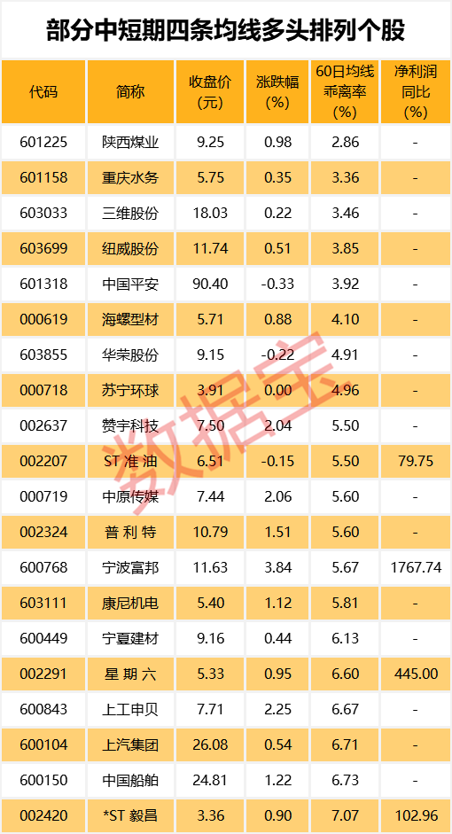 截至9月9日,367只个股5日、10日、20日、60日四条均线近日呈多头排列。其中陕西煤业、重庆水务、三维股份股价与60日均线的乖离率最小,分别为2.86%、3.36%、3.46%。