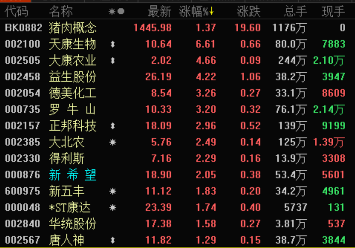 此外,A股猪肉概念股也持续表现强势。今日,猪肉概念板块逆市上涨1.37%。天康生物、大康农业、益生股份涨幅均超过4%。