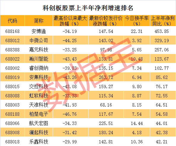 从业绩角度来看,科创板股票普遍上半年实现了高增长态势,29只股票上半年净利增速平均值超47%,中位数超40%。安博通上半年实现净利1464万元,同比增长超过453%。中微公司上半年实现净利3037万元,同比增长超329%。嘉元科技、瀚川智能、睿创微纳等个股上半年净利均翻倍增长,安集科技、交控科技、虹软科技等个股净利增速超50%。仅铂力特、晶晨股份、微芯生物等个股上半年净利负增长。