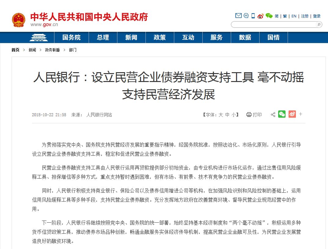 去年10月22日,国务院常务会议决定设立民营企业债券融资支持工具,以市场化方式支持民营企业债券融资。同日,央行发布公告,明确提出“民营企业债券融资支持工具由人民银行运用再贷款提供部分初始资金,由专业机构进行市场化运作,通过出售信用风险缓释工具、担保增信等多种方式,重点支持暂时遇到困难,但有市场、有前景、技术有竞争力的民营企业债券融资”。