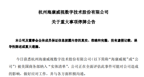 同时,海康威视午间公告称,公司被美国商务部纳入“实体清单”,公司正在全面评估此事件可能对公司造成的影响,做好应对工作,并与各方面积极沟通。公司股票10月8日起停牌, 不迟于10月10日开市起复牌。公司将于10月9日(星期三)15:30-16:00(北京时间)举行关于公司被美国商务部纳入“实体清单”的投资者电话说明会。