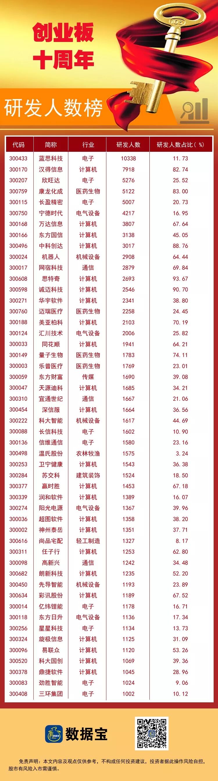 数据宝以最新年度的研发人员数量进行统计,发布“创业板研发人员数量50强”。榜单显示,创业板“巨无霸”公司也不在少数,50家公司研发人员数量均超千人。