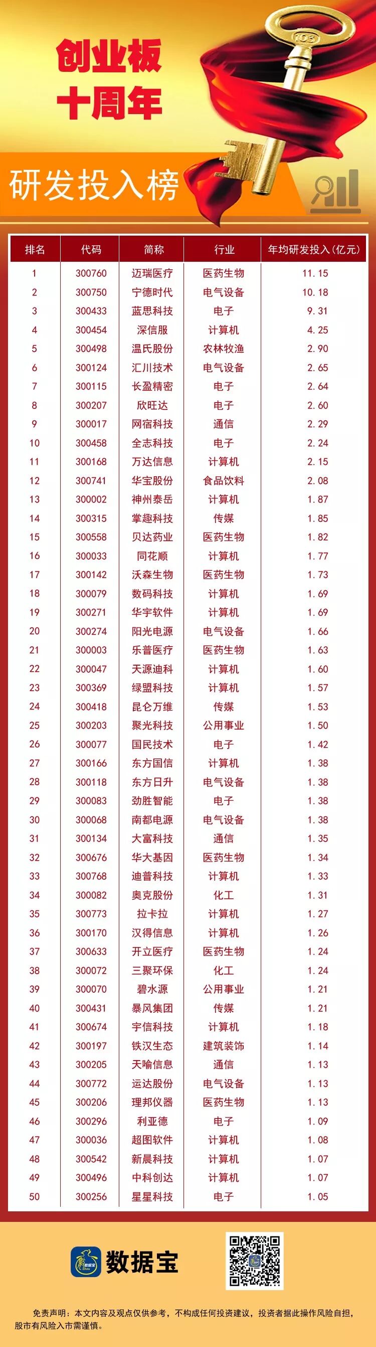 数据宝以创业板上市公司过去十年间的研发投入平均值进行统计,发布“数据宝创业板研发投入50强”,榜单显示,科技型企业占比达七成。