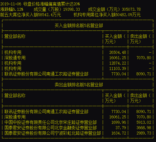 11月6日的龙虎榜数据显示,在买入前5名营业部当中,机构专用席位占据3个席位,分别排名第1、第3和第4,排名第2的仍然是深股通专用席位,联讯证券南通工农路营业部排名第5。卖出前5名营业部分别是深股通专用席位、联讯证券南通工农路营业部、中投证券北京宋庄路营业部、国泰君安宁波彩北路营业部和国泰君安北京金融街营业部。