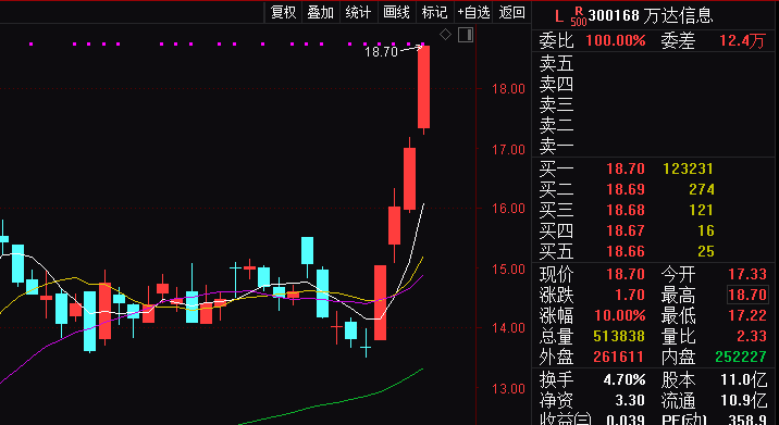 截至e公司记者发稿时止,万达信息报于18.7元,上涨1.7元,涨幅为10%。